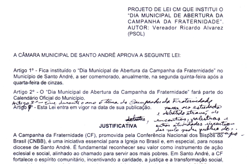 A Câmara de Santo André promulgou nesta terça-feira, 18, o Projeto de Lei (PL) do vereador Ricardo Alvarez (PSOL) que inclui os temas da CAMPANHA DA FRATERNIDADE no calendário oficial da cidade.