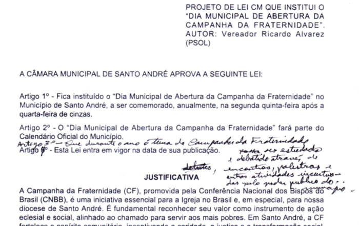 Imagem da emenda feita de próprio punho pelo bispo dom Pedro Cipollini, que prevê a inclusão de estudos e debates dos temas da Campanha na cidade durante o ano. A Câmara de Santo André